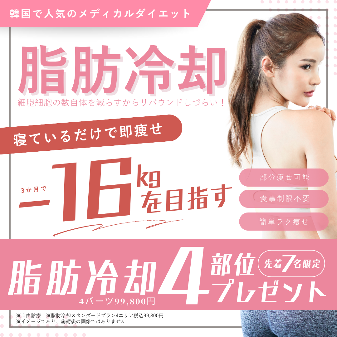 ですが、顔が老け込んだり、リバウンドを繰り返したり…「ただ痩せるだけ」では、理想のボディラインは手に入りません。脂肪細胞そのものを減らす脂肪冷却痩身なら、リスクを最小限にしながら、美しく、持続的な変化を手に入れることができます。
